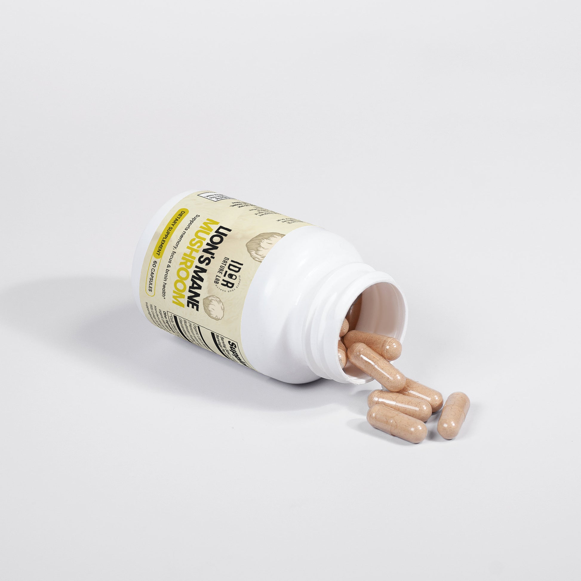 Ingredients: Organic Lion’s Mane (Hericum erinaceus) Mushroom Fruiting Body & Mycelium Powder (Standardized to 40% polysaccharides [400mg]), Organic capsule (pullulan, water), organic pea starch.